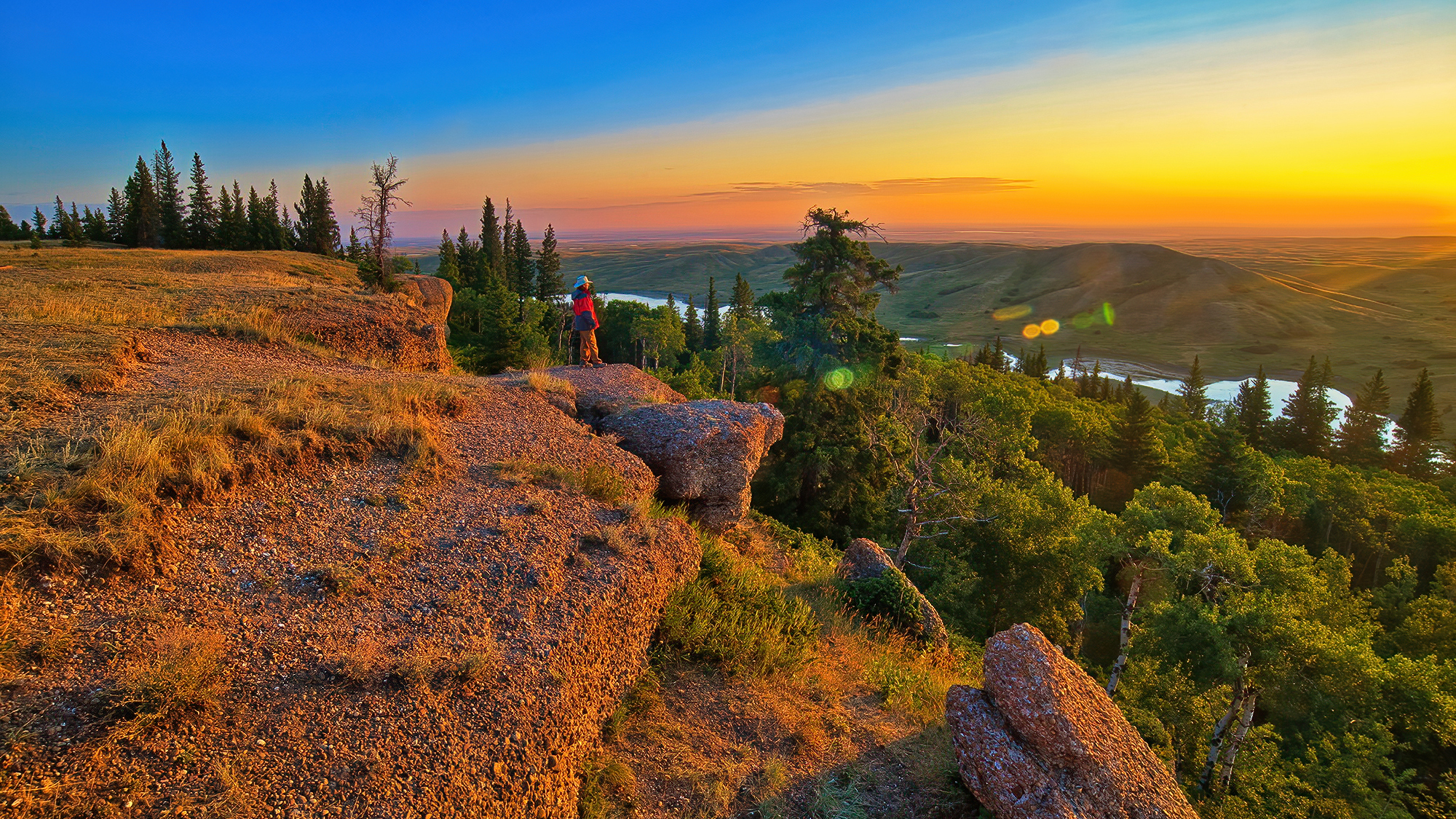 Almost next to each other, Bald Butte and Lookout Point are the most convenient sunset spots in the Cypress Hills, just a few minutes’ drive from the core area of the park’s Centre Block. From the edge of the escarpment on the appropriately named Lookout Point, we gaze north over the mostly open plains some 600 metres below. The town of Maple Creek looms 30 kilometres away, and on a clear day it’s easy to imagine that we really can see forever.