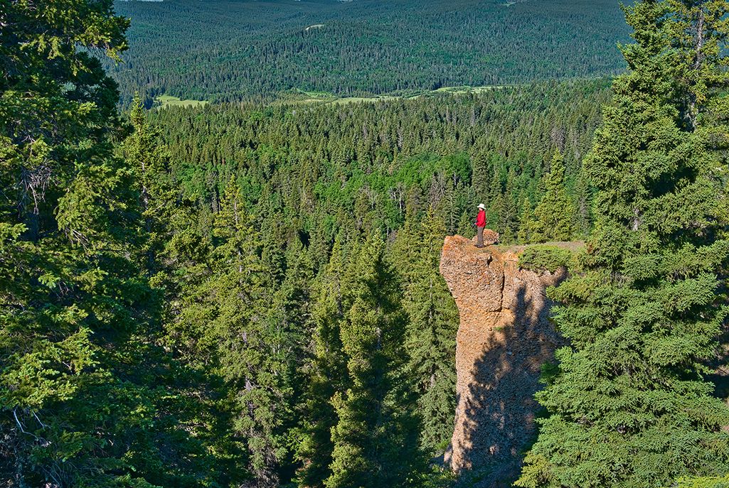 Overlooking Battle Creek Valley, these cliffs are called hidden because they are concealed behind trees when we drive along the valley road. Despite their off-the-beaten-path location, the cliffs are fairly easy to visit. The most scenic approach is along the Trans Canada Trail (also known as the Great Trail). Drive west along Battle Creek Road to just short of the Alberta border, and watch for a trailhead across the road from an old log building (the only building anywhere in the vicinity). It’s a relatively short hike up to the valley rim where the trail passes the hidden cliffs jutting into the valley.