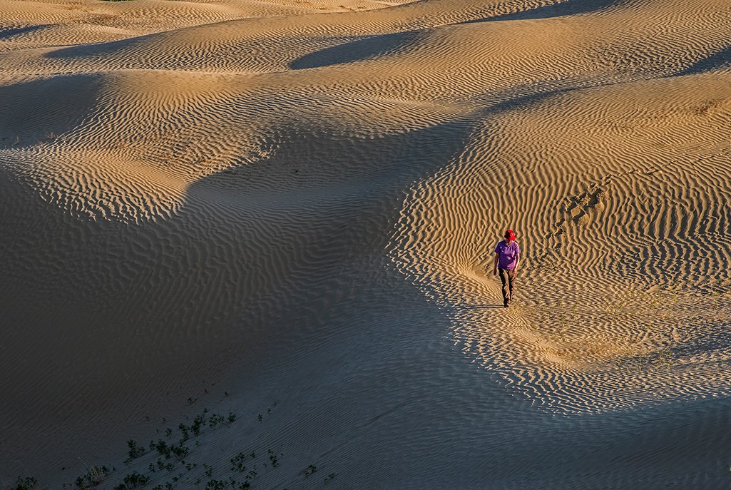 The first big dune is only a short stroll away, plus we can see others scattered in the distance. We soon enter an exotic world of wind-sculpted ripples, blowouts, and desiccated remnants of trees consumed by moving sand. This dry land can produce an amazing array of wildflowers. In early summer, brilliant red blossoms of sand dock bring splashes of colour to the dune edges.
