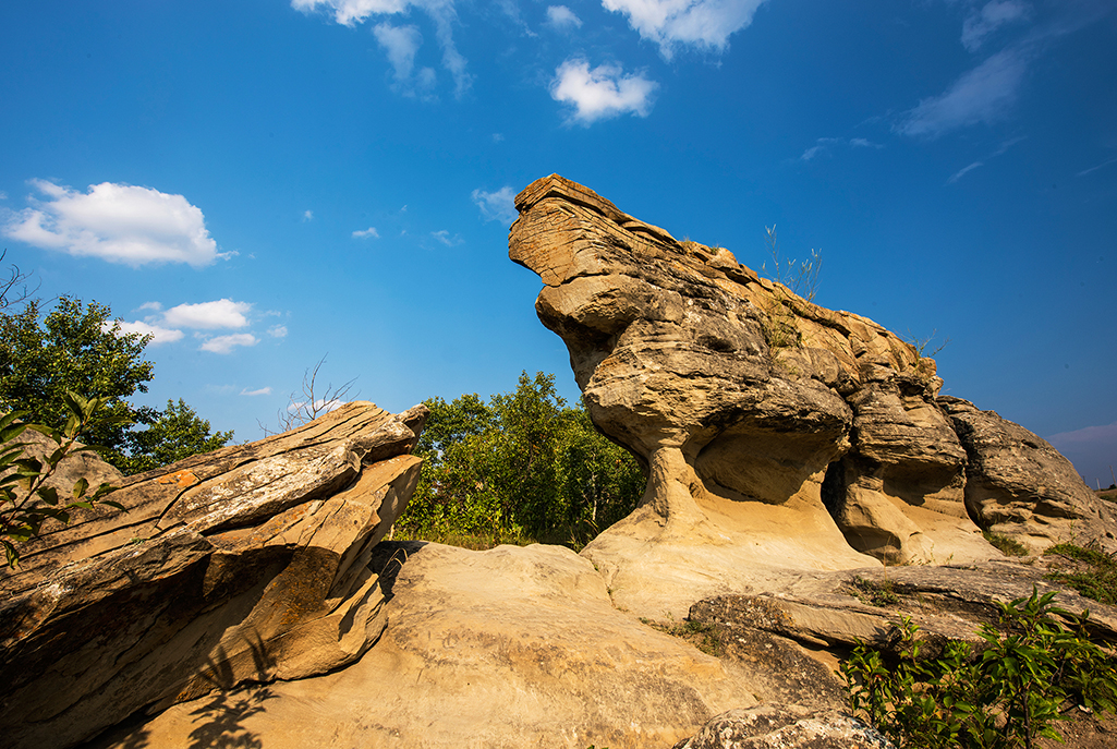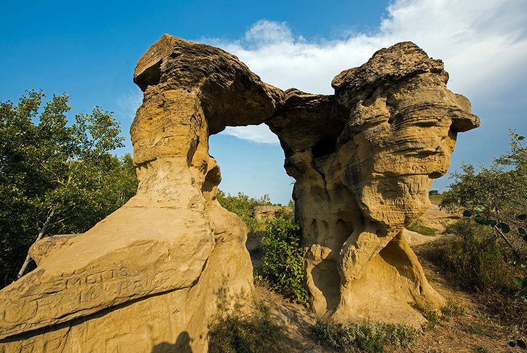 Over the years, the rock served as an important landmark for First Nations peoples, Mounted Police, surveyors, rumrunners and settlers. The site was noted by the Palliser Expedition (1857-1860) and the International Boundary Commission. A cairn nearby commemorates Short Creek Camp, where the North West Mounted Police camped on their historic March West in 1874. Look closely to find names carved into the soft rock dating back well over a century.