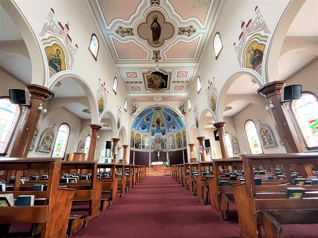 In 1919, German born artist Count Berthold Imhoff, a friend of Abbott Bruno Doerfler (OSB) who headed the parish at the time, painted the cathedral with 80 life sized frescoes and figures. The ceiling, the apse, the walls and archways are adorned with art depicting scenes from the Gospels and persons of faith. Imhoff charged the parish just enough to cover the cost of materials, a total of $3000.00. Some of the Benedictines are depicted in the faces of the saints. St. Paul (on the southeast pillar) is a portrait of Abbot Bruno, who sadly did not live to see the full completion of the project.