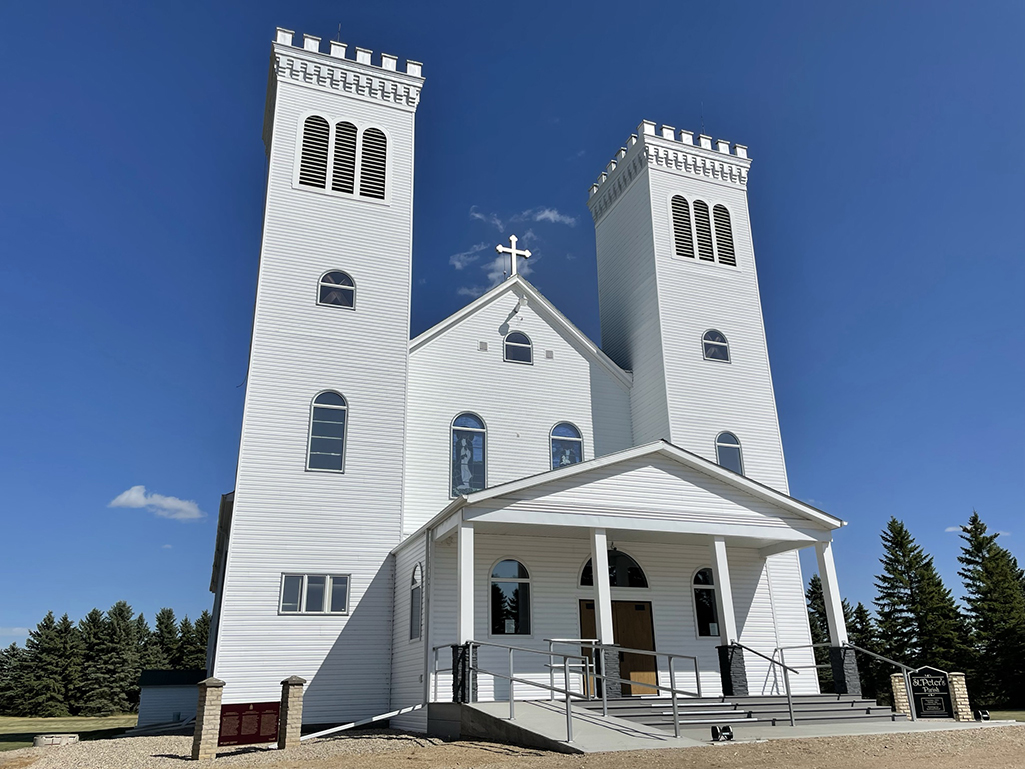 The dusty gravel road off Highway #5 at Muenster, Saskatchewan gives no clues as to what treasure awaits beyond the half kilometre bend. Then, as if transported to the European countryside, the pristine white exterior St. Peter’s Cathedral comes into view. With two towers rising 70 feet skyward, the air fills with awed silence, save for birdsong from nearby forests.