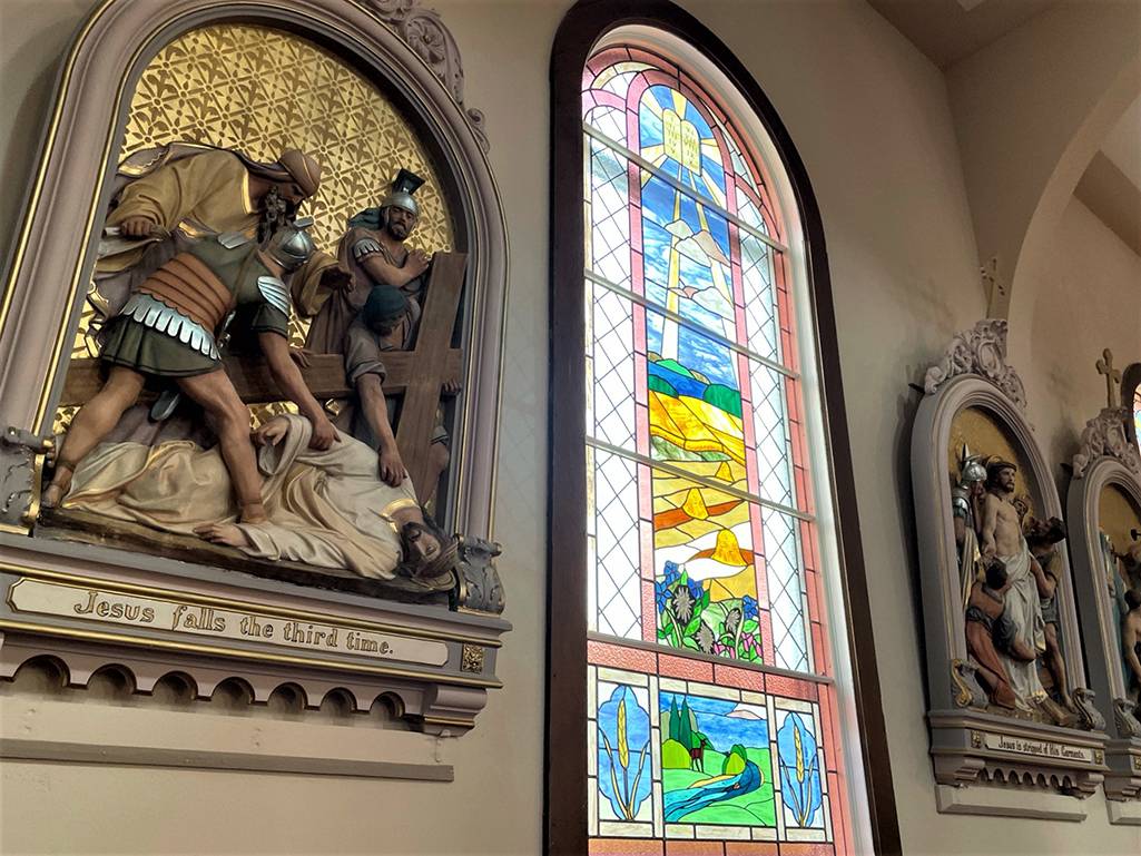 A major renovation to the church in 2010 included the creation of stunning stained-glass windows by Saskatchewan artist Elaina Adams. Almost a century between the making of the art forms, the coloured light through Adams’ windows spotlights Imhoff’s works.