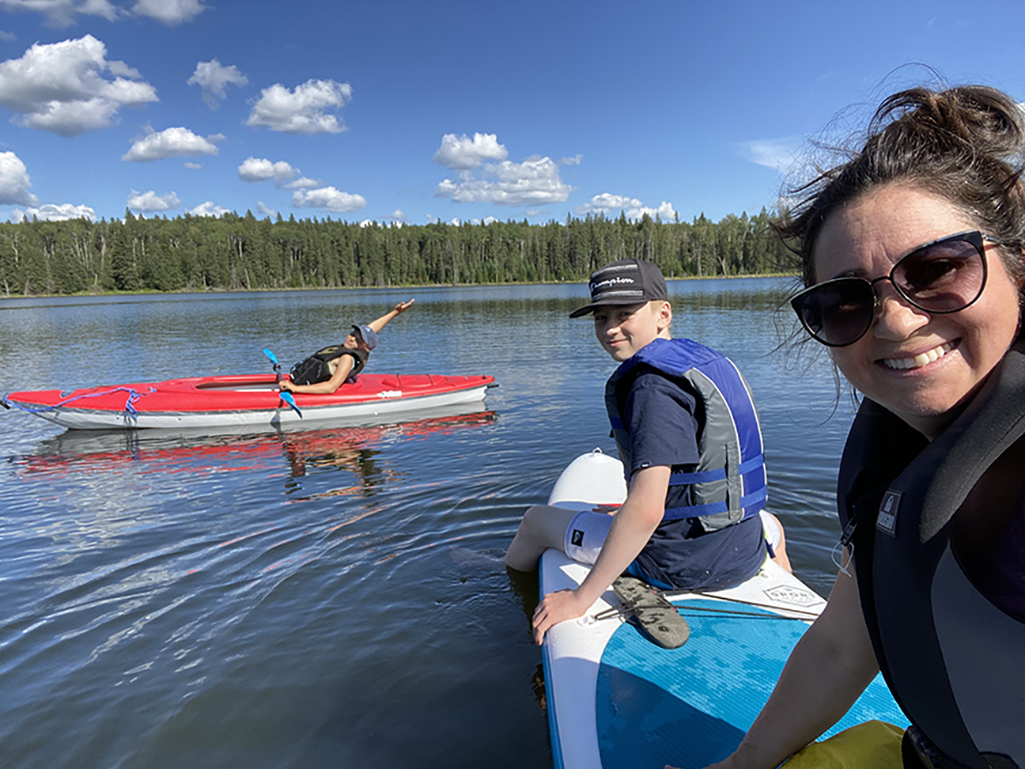 After set-up, we go for a drive to get our bearings and find a place to test out our new water toys we’ve toted along: kayaks and a stand-up paddle board (SUP). After a long drive past Batka Lake and to the Duck Mountain Ski Area, we circle back to find Jackfish Lake. Found across the highway from the campground entrance, it’s an ideal spot for trying out our gear in the a.m.